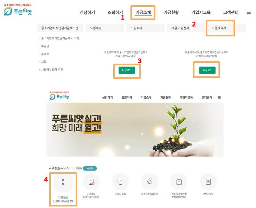 인터넷 신청 방법 : 중소기업퇴직연금 그 금제 푸른 씨앗 홈페이지를 접속하신 후 로그인 하고 상단에 있는 신청하기 메뉴의 가입에 있는 기금제도 신청하기(사업장)을 선택하여 신청을 하시거나 로그인 후 자주 찾는 메뉴에 있는 기금제도 신청하기(사업장) 퀵메뉴를 이용하여 신청하시면 됩니다. 아래 홈페이지로 들어가셔서 보이는 이미지 따라 하시면 됩니다.