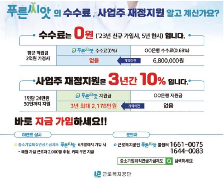 노후대비에 대한 경각심이 점점 커지면서 퇴직연금에 대한 관심도가 높아지고 있습니다. 그런데 중소기업에선 이러한 퇴직연금 제도 도입을 미루고 있는 실정이라 청년들은 중소기업을 외면하게 되는 게 당연한 듯합니다. 그래서 근로복지공단이 푸른 씨앗 퇴직연금 제도를 도입하게 되었습니다. 2023년 신규 가입 시 5년 동안 수수료는 0원, 사업주 재정지원은 3년간 10%라고 하니 바로 가입하시는 것을 추천드립니다. 그럼 푸른 씨앗 퇴직연금 지원대상, 신청방법, 장점에 대해서 자세히 포스팅해 보도록 하겠습니다.